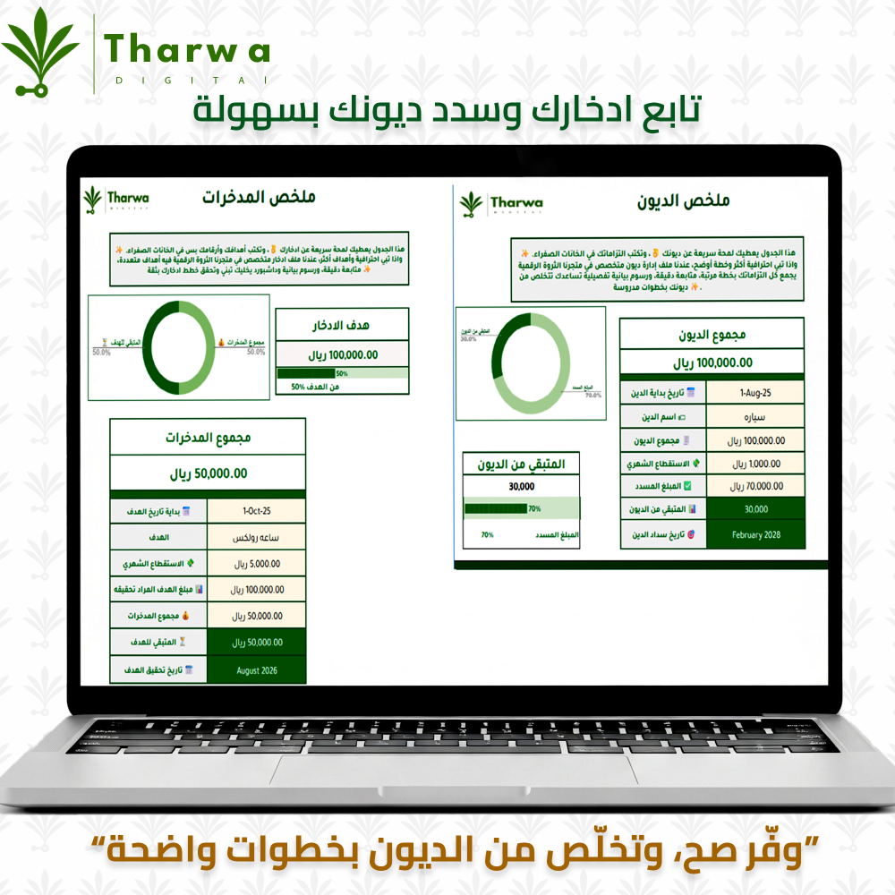 ملف رقمي متكامل بالعربي يخليك تجمع كل تفاصيلك المالية في مكان واحد — الدخل، المصاريف، الادخار، والديون — وتتحكم فيها من جوالك أو اللابتوب بكل سلاسة.